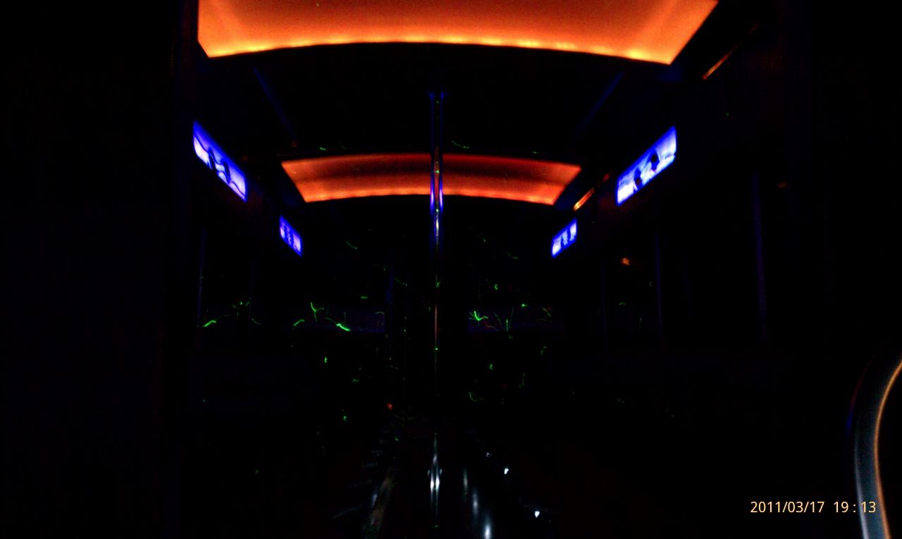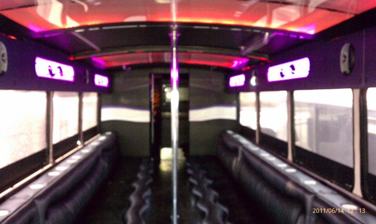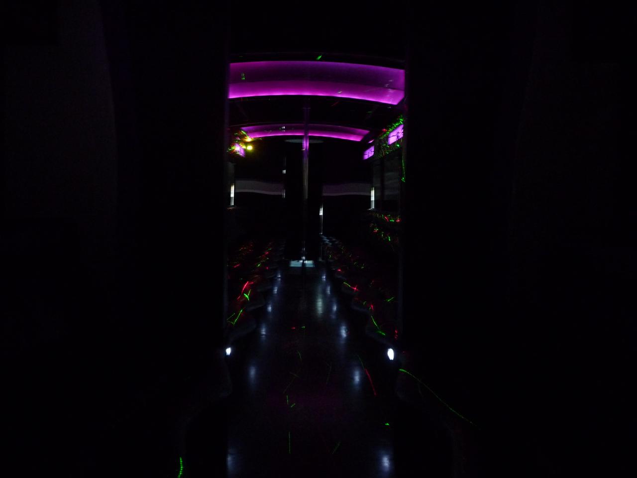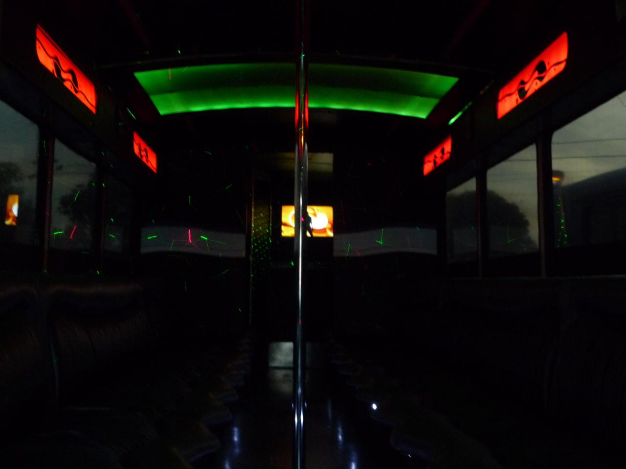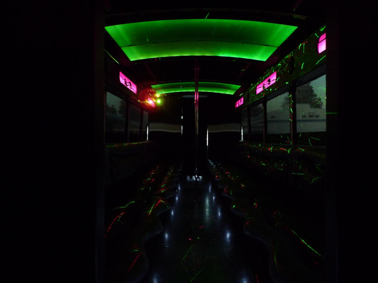 This bus has laser lights, dance pole, ceiling lights and awesome lights with graphics throughout the entire bus.